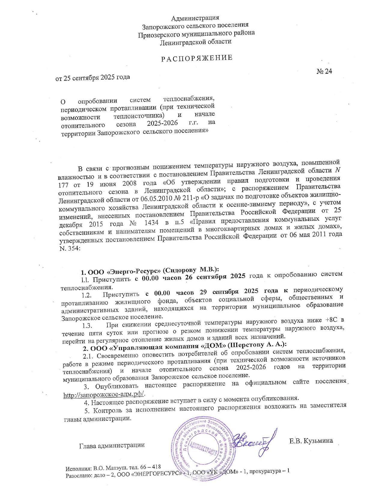 Наименование: | РАСПОРЯЖЕНИЕ от 25 сентября 2025 г. № 24 "О опробовании систем теплоснабжения, периодическом протапливании (при технической возможности теплоисточника) и начале отопительного сезона 2025-2026 г.г. на территории Запорожского сельского поселения" |